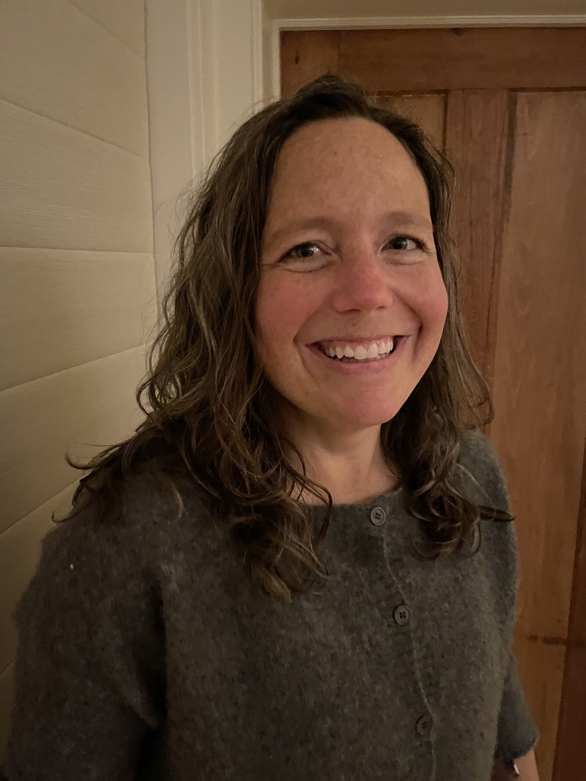Image of a smiling woman with long, curly, brown hair. She is wearing a gray, button-up sweater and standing in front of a wooden door.