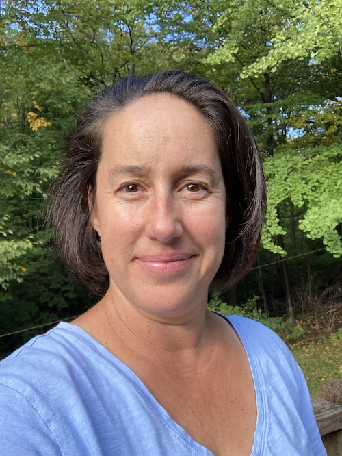 Image of a woman with chin-length brown hair in a light blue, v-neck shirt. She is standing outside against a background of leaves